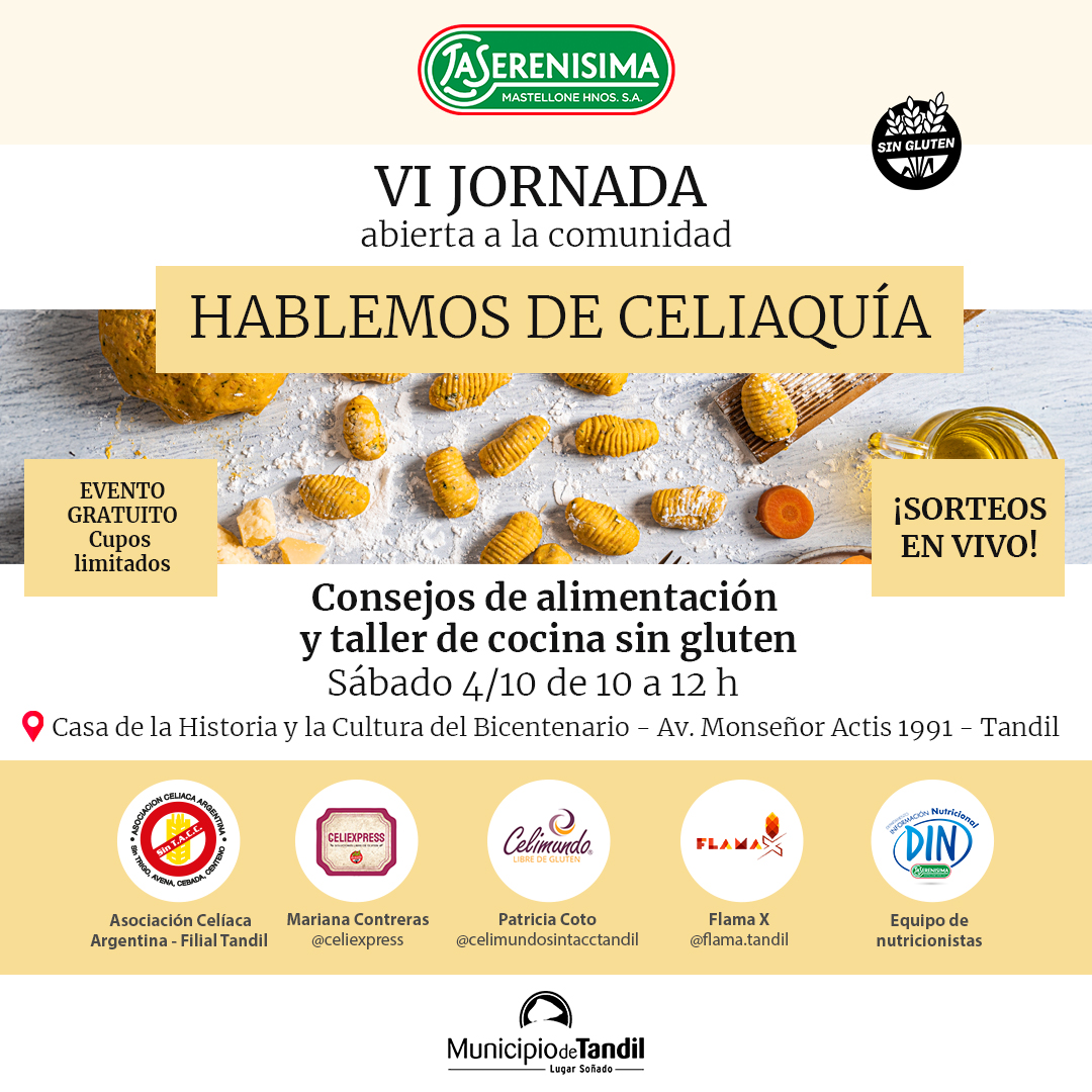 El evento se realizará el próximo 4 de octubre a las 10 h en la ciudad de Tandil. El encuentro, que tendrá lugar en la Casa de la Historia y la Cultura del Bicentenario, contará con una agenda que incluye consejería nutricional especializada, un taller de cocina sin gluten, degustaciones y sorteos. Se trata de un espacio pensado para compartir, aprender y concientizar sobre esta condición que afecta a 1 de cada 100 personas, según datos del