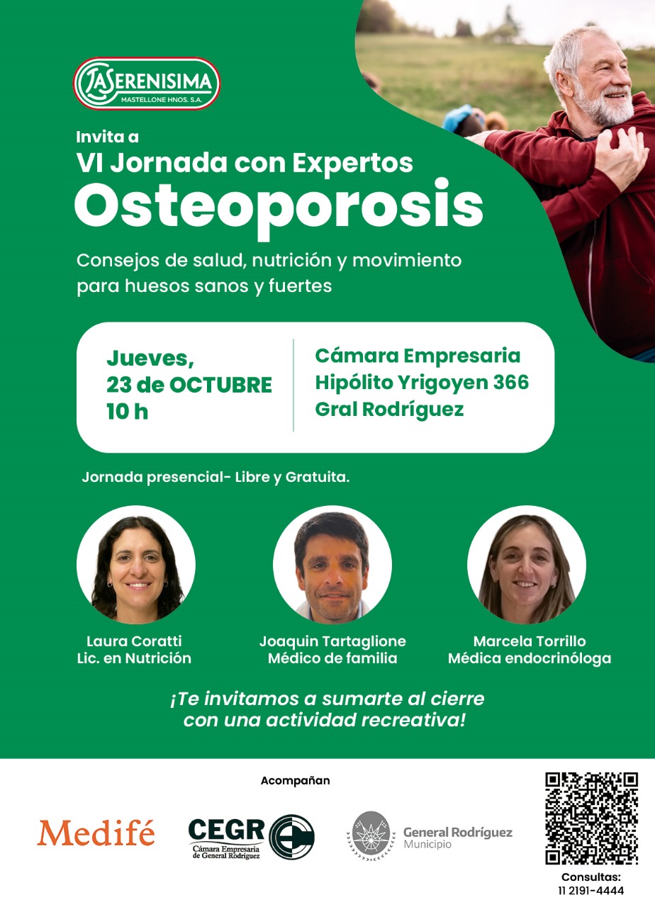 En el marco del Día Mundial de la Osteoporosis, el jueves 23 de octubre a las 10 h Mastellone Hnos. realizará su VI Jornada con Expertos en la Cámara Empresaria de General Rodríguez, con entrada libre y gratuita.