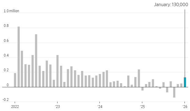 El mercado laboral de Estados Unidos sumó 130.000 nuevos empleos durante el pasado enero, el mejor dato en 12 meses, según la estadística publicada este miércoles por la Oficina de Estadísticas Laborales. La cifra mejora la expectativas de los analistas, que esperaban un dato mucho más débil (entre 45.000 y 60.000) debido a la oleada de despidos de las tecnológicas que buscan, por un lado, desbloquear recursos para poder mantener la alocada carrera de inversiones de la inteligencia artificial (IA) y, por otro, aprovechan los aumentos de productividad que proporciona esta tecnología para reducir costes.